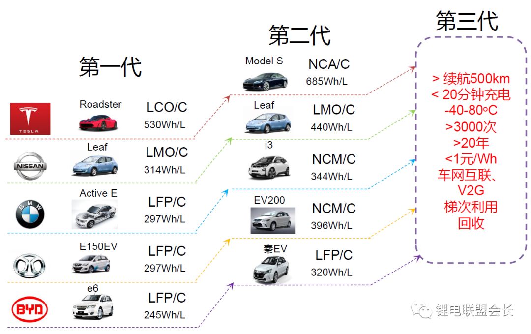 每一次電池性能的顯著提升,本質(zhì)上都是電池材料體系的重大變革。從第一代的鎳氫電池和錳酸鋰電池,第二代的磷酸鐵鋰電池,到目前廣為采用且預計持續(xù)到2020年左右的第三代三元電池,其能量密度和成本分別呈現(xiàn)出階梯式上升和下降的明顯趨勢。因此,下一代車用電池選用何種電池體系,對于實現(xiàn)2020~2025年的電池目標至關重要。
